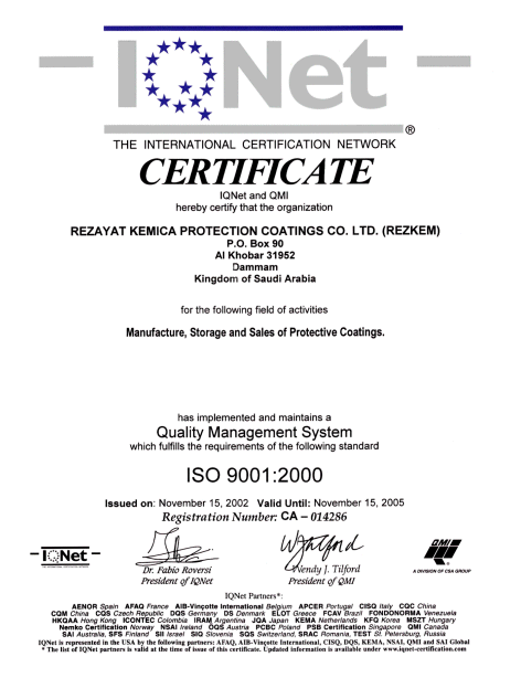 QMI certificate of membership allowing Rezcoat to manufacture, store, sell and distribute liquid chemical coatings from our plant in the 2nd Industrial City of Dammam.